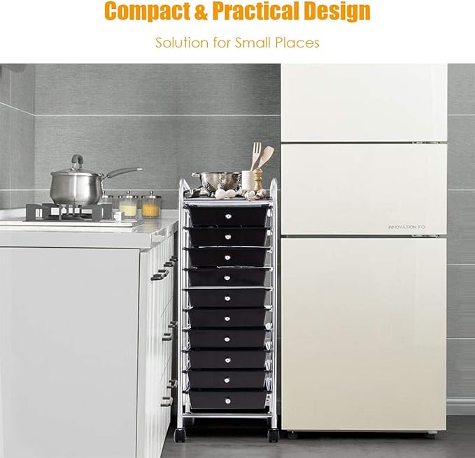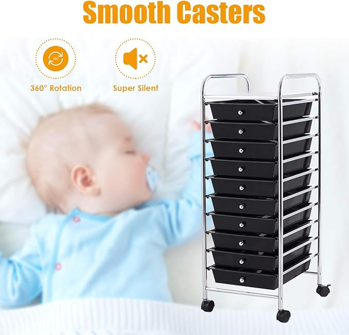Storage Cart, Rolling Utility Cart with 10 Drawers, Portable Handles & Lockable Wheels, Mobile Paper Toys Storage Organizer Large Capacity for Home Office School Teacher (Black)