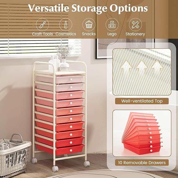Storage Cart, Rolling Utility Cart with 10 Drawers, Portable Handles & Lockable Wheels, Mobile Paper Toys Storage Organizer Large Capacity for Home Office School Teacher (Gradient Pink)