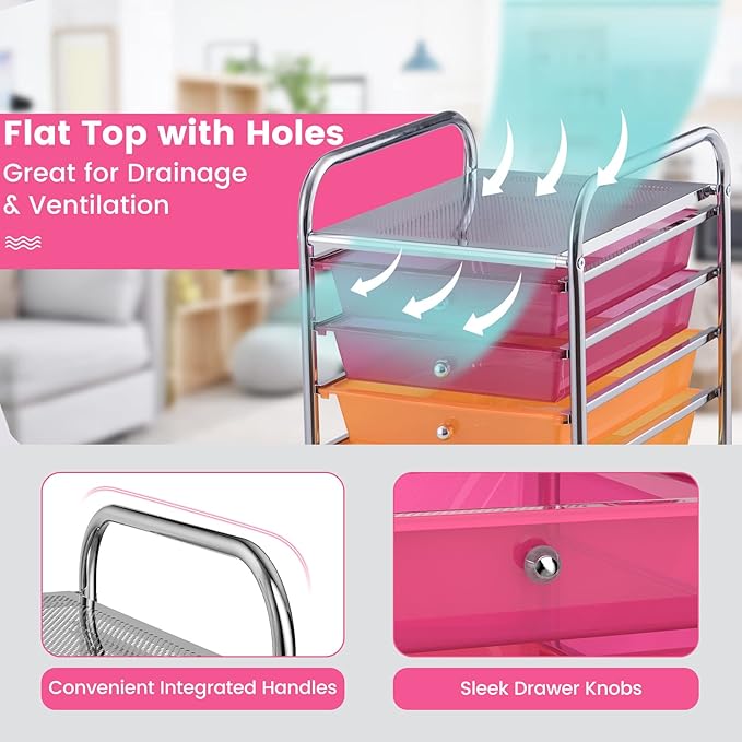 - ✨【Durable Metal Frame & 22 lbs Load】This rolling storage cart is supported by high quality chrome finished steel frame, which can hold up to 22lbs. Each drawer can hold 3lbs. Besides, the tabletop adopts a metal shelf with meshes, promoting better air circulation and keeping the interior dry and fresh.