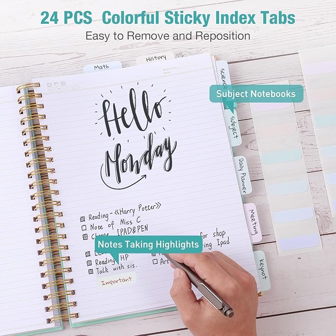 - Thoughtful Pink Notebook: ①Notebook with tabs, 24 pcs in 6 different colors sticky tabs, easily remove and reposition to mark, index, classify, and highlight. ②2 Built-in large pockets for loose leaf paper organized. ③Elastic band for secured closure. ④Elastic pen loop for different sizes’ pen accessible.