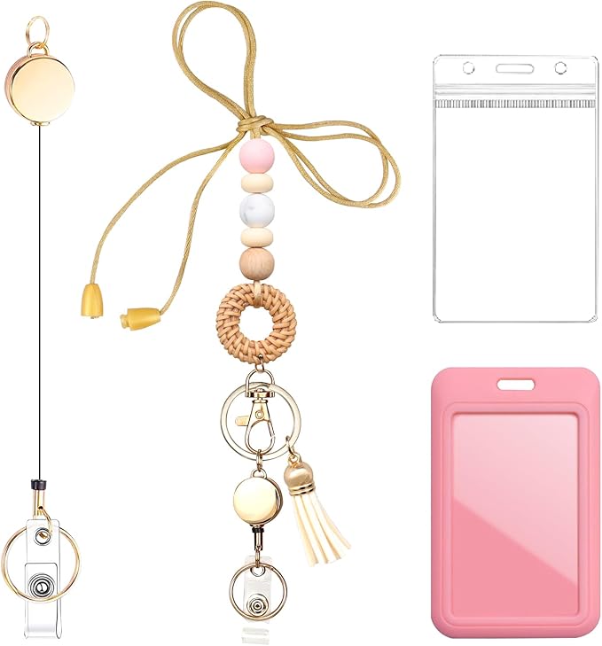 Colorful ID Badge Holder with Silicone Beads Lanyard Set,Cute Teacher Breakaway Lanyard for Keys & Keychain with Cute Retractable Badge Reel Holder,Gift for Women,Nurse, Teacher. (D)