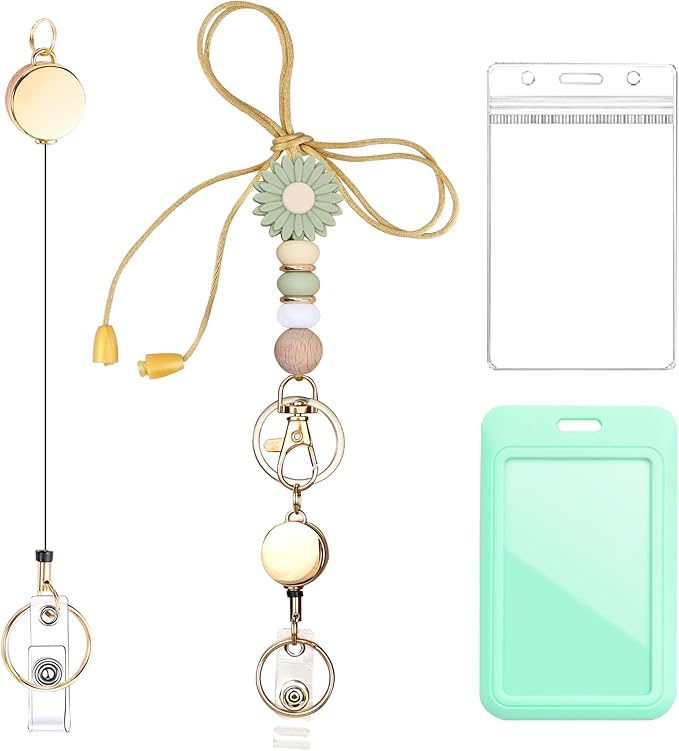 Colorful ID Badge Holder with Silicone Beads Lanyard Set,Cute Teacher Breakaway Lanyard for Keys & Keychain with Cute Retractable Badge Reel Holder,Gift for Women,Nurse, Teacher. (Green Daisy)