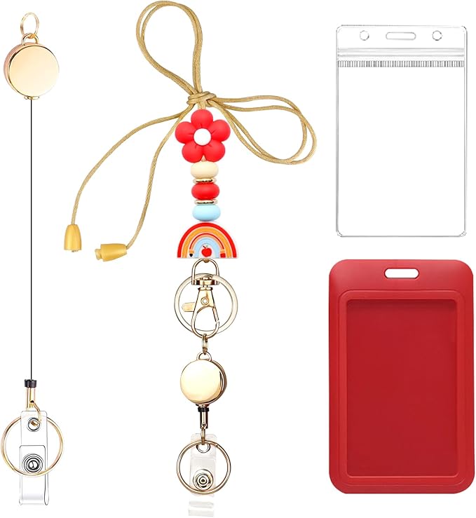 Colorful ID Badge Holder with Silicone Beads Lanyard Set,Cute Teacher Breakaway Lanyard for Keys & Keychain with Cute Retractable Badge Reel Holder,Gift for Women,Nurse, Teacher. (Rainbow 1)