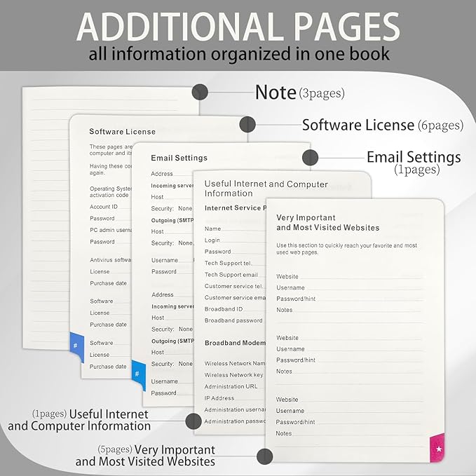 - More Pages, More Entries - This password notebook features 115 sheets of thick 100gsm paper, capable of storing up to 851 passwords—almost twice the capacity of others on the market. It also includes ample space for internet service providers, wireless router settings, software licenses, email settings, frequently visited websites, and additional notes.