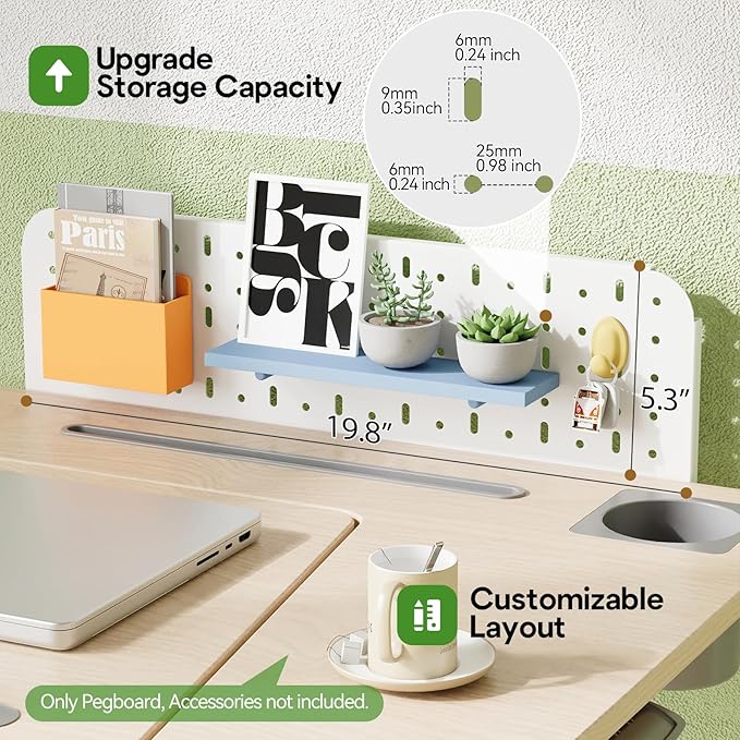 - Better Storage Design: Special DIY pegboard creates the best storage solution for the small items on your desktop. The width adjustable base board provides you with two optional sizes to place your bag or host on