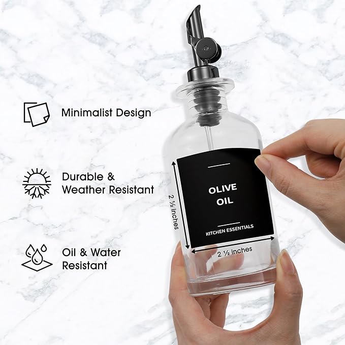 Olive Oil & Coffee Syrup Labels for Bottles - 2.5" x 2.5" Waterproof Kitchen PVC Sticker Labels for Oils, Coffee Syrups, Vinegars, Sauces, Cooking Wines, Condiments - Minimalist Black, 61pcs