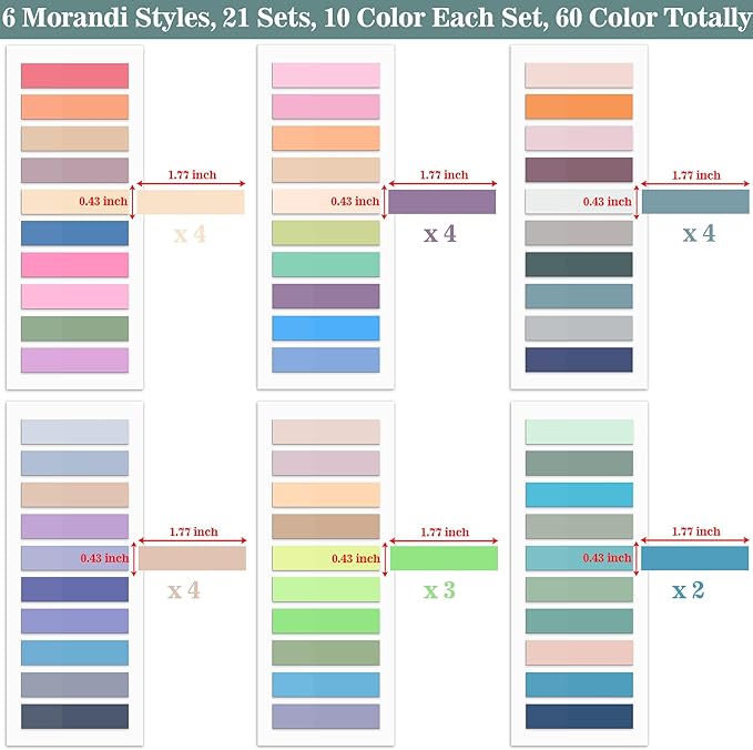 - 60 Morandi colors: 21 sets morandi sticky tabs in 6 styles, 10 colors for each style, colorful book tabs can help you find and locate information quickly, you can organize categories by color flexibly