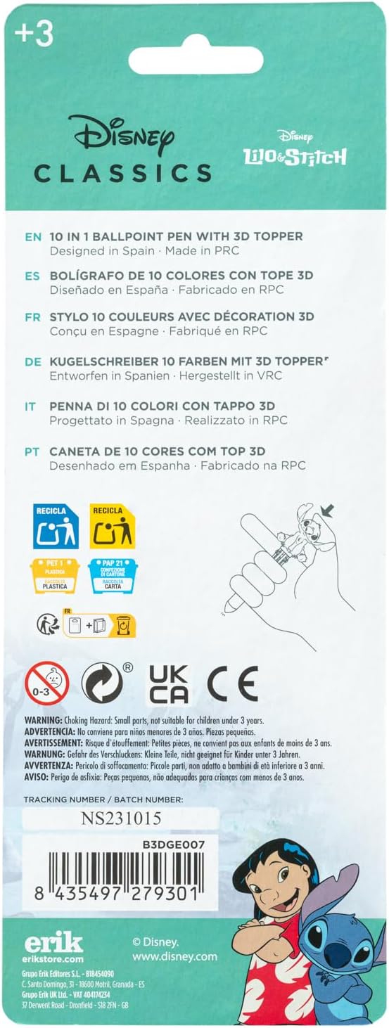 - 🩵 Specs - This multicoloured pen is made of PVC and has 10 colours with a fun 3D topper with Stitch figure. Ball point pen contains 10 colours in 1 single pen: purple, blue, light blue, red, yellow, orange, green, pink, brown and black ink.