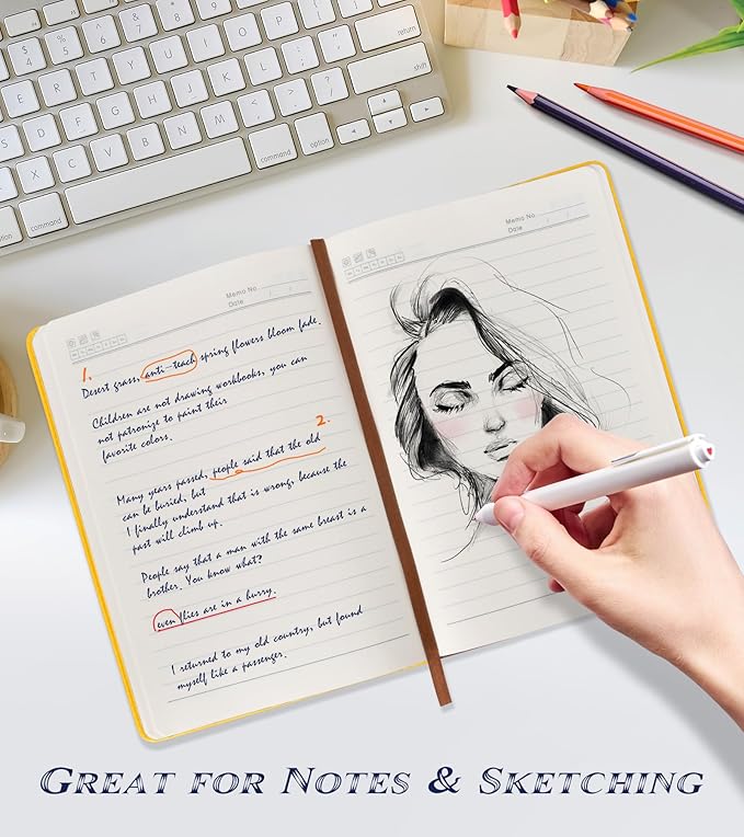 - 【180° Lay Flat Design】The 180° lay flat design makes writing easier, reading more convenient, and taking notes more efficient.At the same time, the hardcover notebook is designed with elastic closure band to make it tightly closed to protect your content, and the inner paper will not be curled and kept flat.