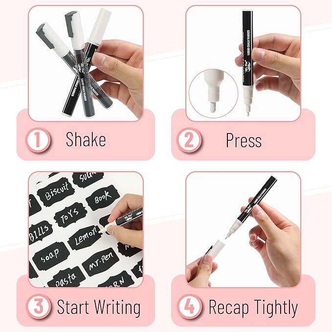 - The included white chalk marker writes smoothly on the labels and can easily be wiped off with the small towel, allowing you to update labels as needed.