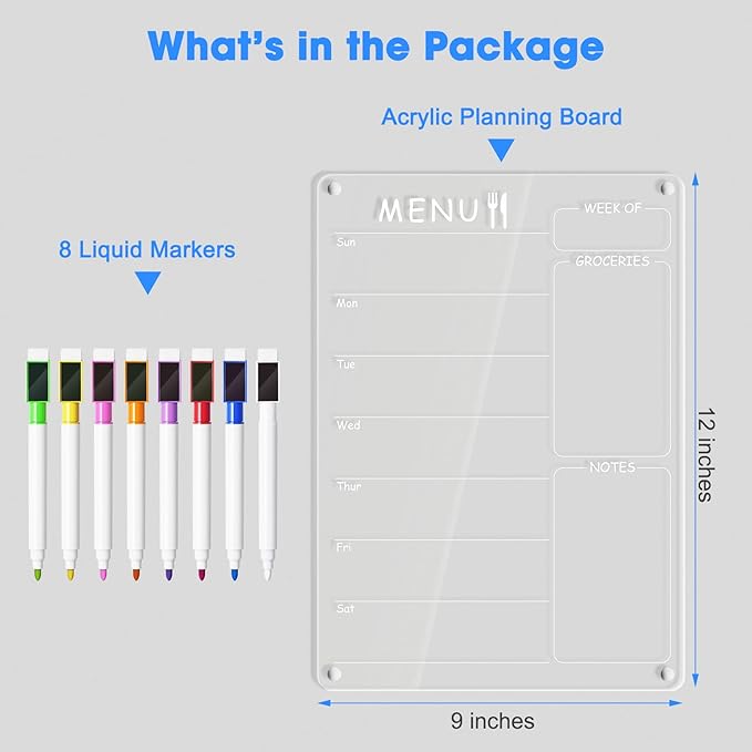 - What's in the Box: one 12''x9''transparent acrylic fridge weekly planning board, 8 markers. This fridge weekly calendar dry erase magnetic & weekly planner for metal fridge is perfect Mother's Day/New year/Christmas/Father’s Day/birthday gift ideas for Back to School / Off to College / friends, families, office work, colleagues, mother/mom, father/dad, party decorations supplies.