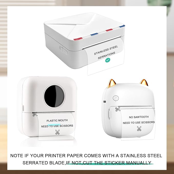 - SPECIAL NOTE: 1: Do not place thermal paper in high temperature or acidic environment, otherwise it may accelerate fading. 2: The transparent thermal paper you receive is relatively strong due to its special material. If your mini printer does not have a stainless steel jagged cutting edge, please use scissors to cut off the sticker after printing.