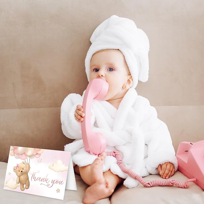 Whaline 24 Packs Bear Thank You Cards Pink Bear Balloon Greeting Cards Cute Cartoon Blank Note Cards with Envelopes and Stickers for Baby Shower Birthday Holiday Party Supplies, 4 x 6 Inch