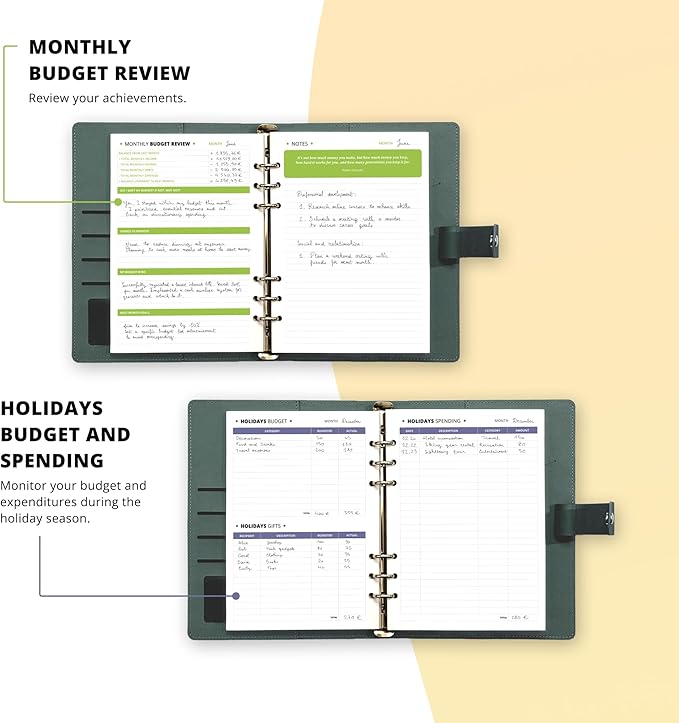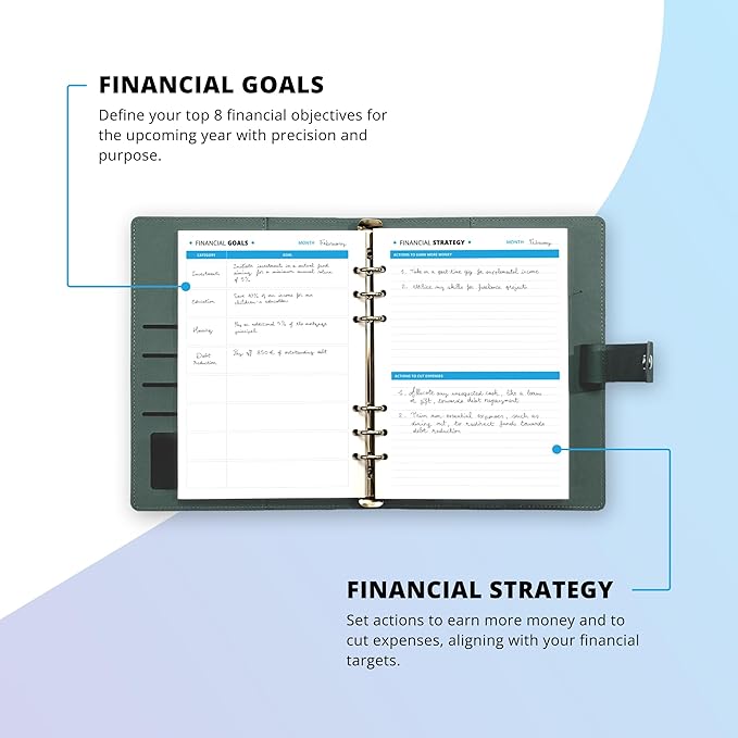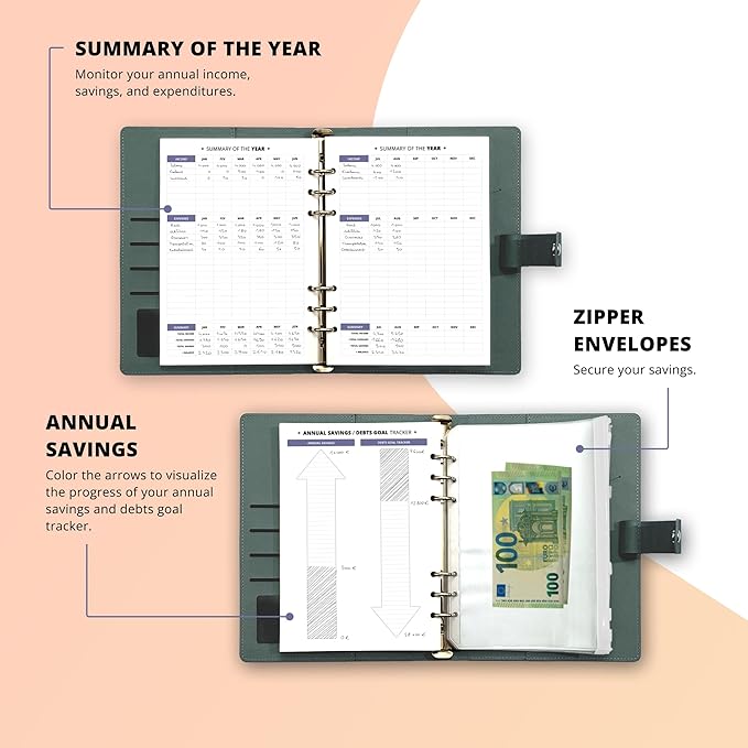 - [THE PERSONAL FINANCIAL PLANNER INCLUDES]: A high-quality elegant PU leather and budget binder with 12 zipper envelopes for saving cash stuffing or to store your bills and receipts. Plus, it comes with 1 erasable pen so you can write and erase easily. Content of the pages : financial goals and strategy, monthly plan and budget, saving and debt tracker, daily expenses, monthly review, holyday budgeting , yearly summary pages and 12 set of note pages.