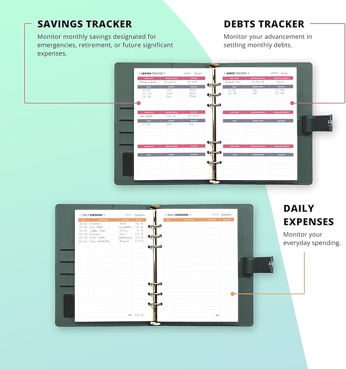 - [ALL IN ONE]: Get the benefits of a budget binder and Budget Planner in a single item. Our refined and ergonomic design will allow you to carry and manage the transaction register wherever you go. Also, thanks to its 2.5 cm Silver-colored rings, they will allow you to easily move or take out the sheets to where you need them most!