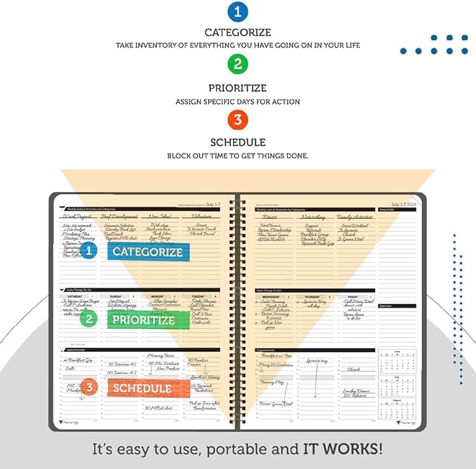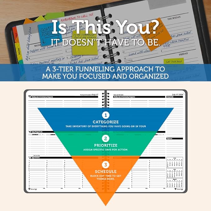 - EXCLUSIVE 3-TIER FUNNEL DOWN approach helps you prioritize and organize all that matters. Section 1- CATEGORIZE is to inventory everything you have going on. Section 2 - PRIORITIZE items from section 1 to specific days for attention. Section 3 - SCHEDULE is to block out time for tasks from section 2
