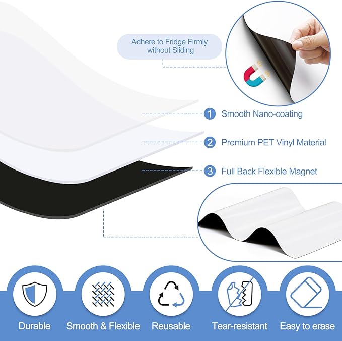 - 【FULL-MAGNET BACK DESIGN】 - Ensure strong and stable attachment to any metal surface with each board's thick full-magnetic back. They can be firmly attached to the refrigerator, microwave oven, dishwasher, file cabinet, metal door and any magnetic or metal surface. Also, the white board can be cut to any size or shape based on needs.