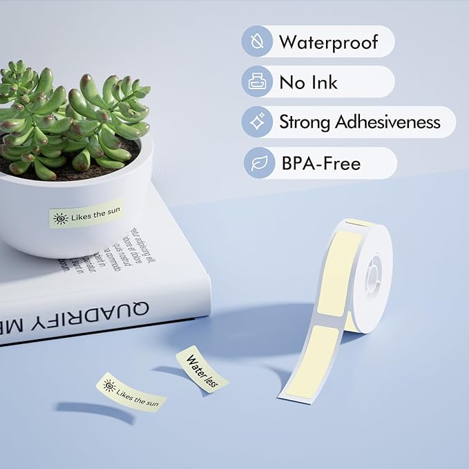 - Refill Labels - One roll of direct thermal labels with size 12 x 40 mm(0.47'' x 1.57''), 160 labels/roll, light yellow label tape, self-adhesive sticker, black and white printouts