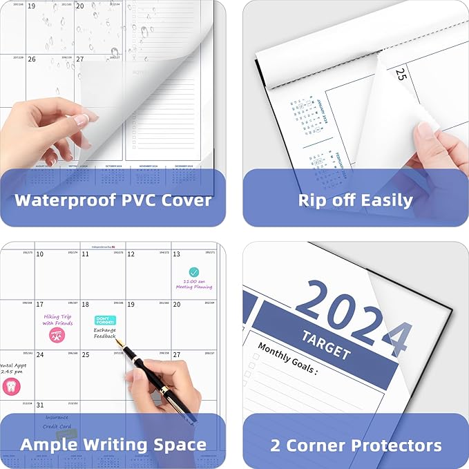 - 【Premium Thick Paper】With a weight of 0.264lb per sheet, the 2024 calendar is designed using premium thick paper, ensuring a high-quality writing experience. It is resistant to ink seepage, resulting in clean and crisp writing. To safeguard the calendar from dust and liquids, it comes with a transparent PVC cover. Two corner protectors are included to keep the pages flat. Plus, the cutting line allows for effortless tearing of each month's page. This desk calendar is perfect to long-term use.