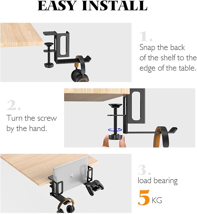 - 【High Quality Steel Material】Our side hanging desk organizer is made of high quality steel .Made of durable, scratch-resistant Aluminum Alloy of holding maximum 11 lbs. this stand ensures the long-term safety of your laptop. A silicone mat safeguards your MacBook from scratches while securing it in a stable position