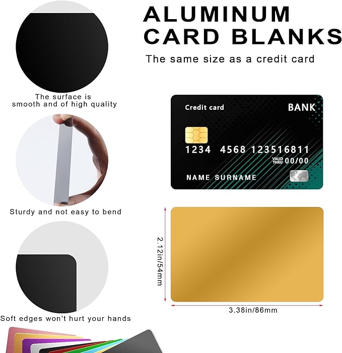 - 【Materials and sizes】These colorful metal business cards are elegantly designed with certain artistic connotations. The engraving won't fade or scratch easily, ensuring your creations maintain their beauty for a long time. Each name card is 3.4*2.2*0.01inch, which is similar in size to a bank card and can be easily put in a pocket or wallet