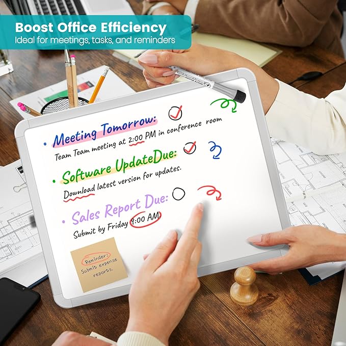 - Double-Sided Design, Double the Space: Unlike other small whiteboards, our double-sided whiteboard offers twice the writing area, making it ideal for organizing schedules, jotting down ideas, and managing multiple projects. It's the perfect family organizer and office whiteboard, enhancing productivity and creativity.