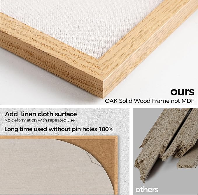 - OAK-Frame Material: Our cork boards for walls is made of 100% Oak wood which has well self-healing ability and repairability. The pin board features a four-ply splint design that is strong and thick enough not to be punctured by thumbtacks.