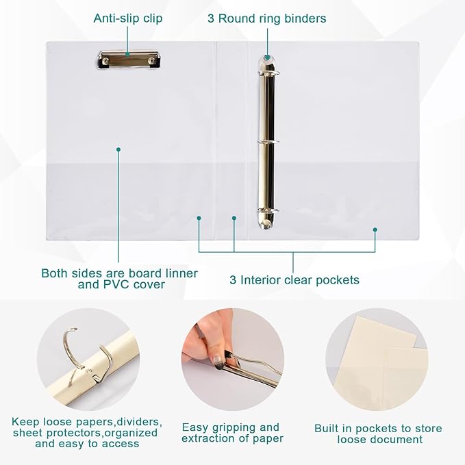 - 【1.5 Inch Ring Binder】There is a anti-slip clip on the left side that can fix paper, and 3 ring binders that each have 1.5" round on the right side.
