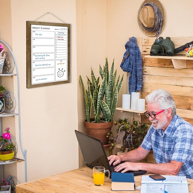 Dry Erase White Board Weekly Calendar Board, Magnetic Whiteboard for Wall,13“x17 Solid Wood Rustic Brown Framed Message Board, Planner Board for Office, Home, School(Weekly-BB-RB-3343)