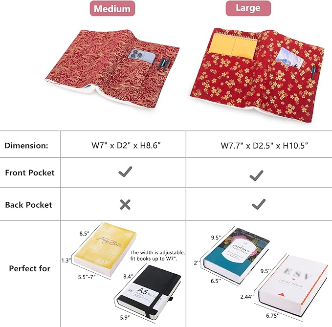 - SIZE - Comes 2 sizes for you to choose from. Medium: W7" X D2" XH10.5" which fits the book in the size of W5.5" X H8.5",AA Big Book (5.5”x8.5”) or 12 Steps & 12 Traditions or A5 Journal notebook; Large: W7.7" X D2.5" XH10.5" which is just for the woman's study bible or ESV bible in size of W6.75"XD2.24" XH9.5". The width of the book cover is adjustable. Please measure your books when ordering.