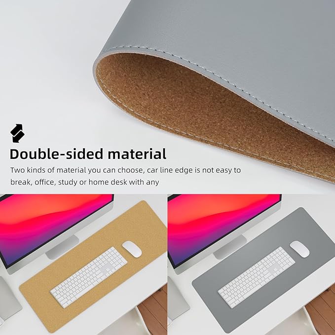 Leather Desk Protector, 47in*23.7in Large Mat with Natural Cork & PU Leather, Mouse Pad, Non-Slip Office Mat, Waterproof Writing Pad for Office and Home (Light Grey)