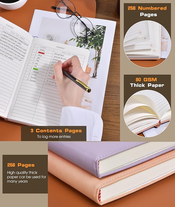 - 【256 Numbered Pages with Contents】 This journal notebook is specifically designed to provide you with all the writing space you need. It includes 256 pages numbers and a 3-page blank table of contents, you can jot down important notes from various pages and note them in the front of the book for easy and fast reference. 80Gsm acid-free ivory paper that's smooth to the touch and thicker than your average notebook. Which ensures that there will no ghosting or bleed-through on your pages.