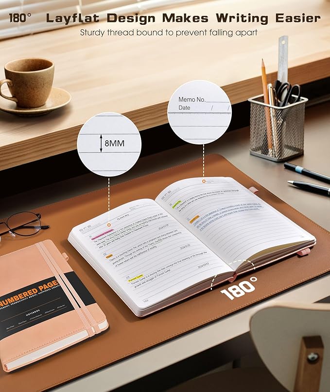 - 【180° Lay Flat Design】The 180° lay flat design, combined with a sturdy thread-bound binding, the leather notebook can easily to lay out flat makes taking notes more efficient, reading more convenient, which provide a comfortable writing experience. Rounded corner design makes the lined notebook not easy to be damaged and curled. Standard 8mm space classic college ruled journals, each journal page has “Memo No” and “Date” header to help you keep track of the date.