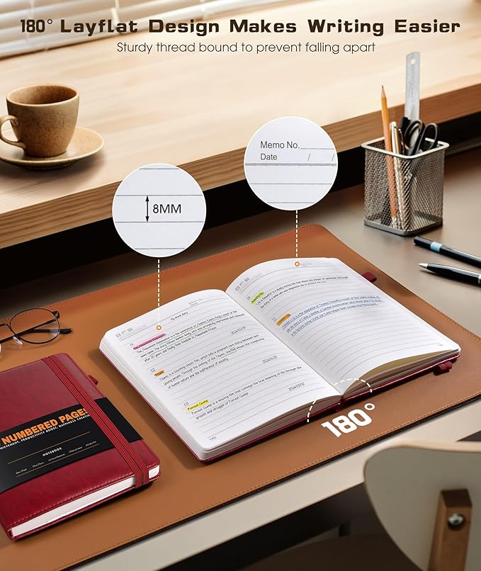 - 【180° Lay Flat Design】The 180° lay flat design, combined with a sturdy thread-bound binding, the leather notebook can easily to lay out flat makes taking notes more efficient, reading more convenient, which provide a comfortable writing experience. Rounded corner design makes the lined notebook not easy to be damaged and curled. Standard 8mm space classic college ruled journals, each journal page has “Memo No” and “Date” header to help you keep track of the date.