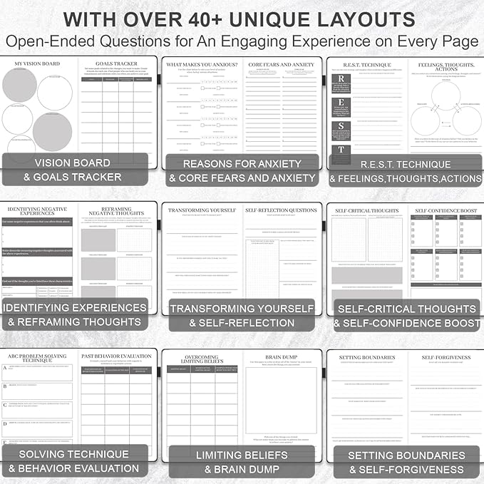 - PREMIUM QUALITY & USER-FRIENDLY DESIGN: This A5 size self-help journal has a sturdy hardcover with an attractive hot silver pattern for both aesthetics and durability. Its thick 120gsm white paper is perfect for writing without bleeding or smudging. Complete with 3 colorful ribbon bookmarks, a sturdy pen loop, an elastic band, and a back pocket. With no overt mention of "worry" or "anxiety" on the cover, your personal journey remains private, allowing you to take it with you wherever you go.