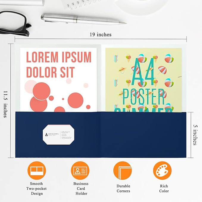- KEY FEATURES:Two pocket folders with 5" pockets,Each pocket can hold up to 50 sheets,But can even handle more.Four-corner business card holder eliminates popout