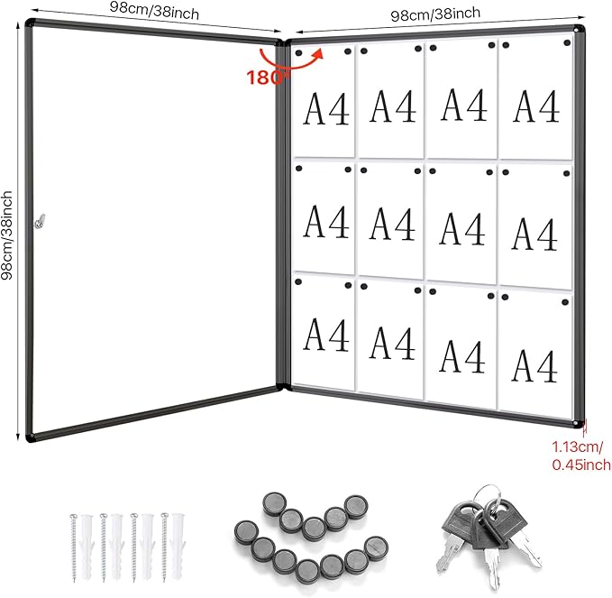 SWANCROWN Enclosed Bulletin Board Black Frame Enclosed Display Case,with Magnets,for School Message Notice, 38x38inch (12xA4)