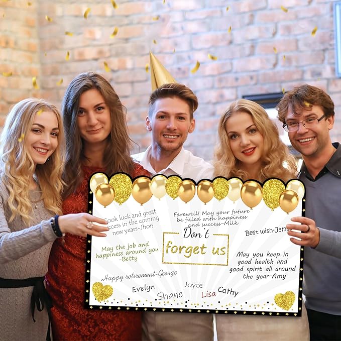- 【Unique Design】 The double-sided design features premium black and gold tones, blending playful phrases like 'We Will Miss You,' 'Good Luck,' and 'Don't Forget us' with celebratory motifs. This distinctive design incorporates elements such as balloons and fireworks to create a memorable atmosphere.