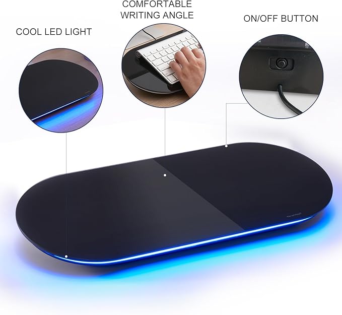 - PERSONALIZED DESIGN: The 17" X 7" desktop glass whiteboard is designed with a string of blue lights around the board, keep the usb cable plugged in, get a cool led whiteboard. The oval plate makes you feel better to hold and save more space on the table.