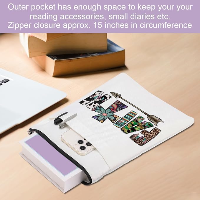 - Zipper Close & Outer Pocket Storage: The book cover closes with high-quality smooth zipper so the book won't slip out of the book sleeve accidentally. It has an additional organizer pocket, and the size is about 9.5 x 8.7 inches offers a enough space for your accessories, notebook, as e-reader, small diaries, stationery, cosmetics, sunglasses, or other small decorative stuff. Great convenient for your daily use.