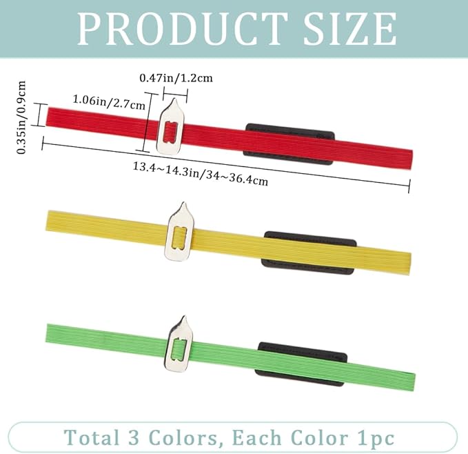 - SIZE: elastic bookmarks about 0.35~1inch (9~27mm) wide, 13.38~14.33inch (340~364mm) long, 0.03~0.07inch (1~2mm) thick, 3 colors, 1pc/color, 3pcs/bag.