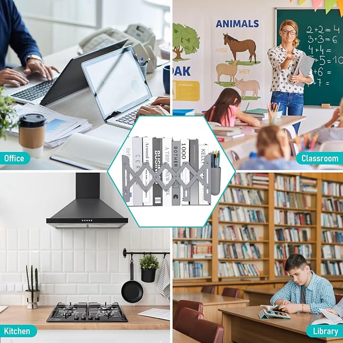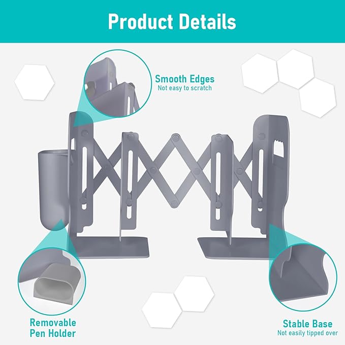 - PREMIUM MATERIAL: The expandable bookend is made of thick ABS material, which is sturdy, durable, lightweight and rust-free. The one-piece chain structure hold a large quantities of heavy books stably without slipping and tipping. Smooth edges make it resistant to scratches and chips.