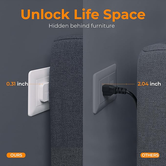 - Flat Extension Cord 15 ft: With only 0.31 in ultra thin flat head design, flat power strip can easily fit in tight spots and hide behind sofa, bed, nightstand or other furniture, sitting flush against the wall; 45° right angle design create an extra space for other plug below without blocking