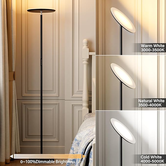 - 【3 Color Temperatures and Stepless Dimming】Floor lamps for living room has stepless brightness adjustment as well as 3 color-temperature settings from 3000/3500/4000 5000K, for warm white, natural white, and cool white light. Tall pole lamp has different modes for you to choose from: reading, office, sleeping, babycare, etc., as well as ONE Timer Setting function plus.