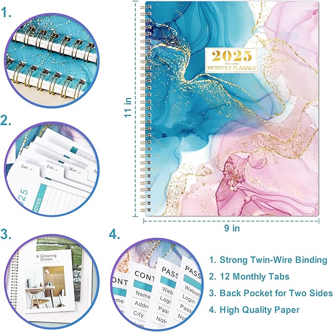 - Functional Design - Strong twin-wire binding for the 2025 calendar planner lay-flat 360° +12 monthly tabs for quick reference + The two side back pocket for holding some items + Golden stamping cover.