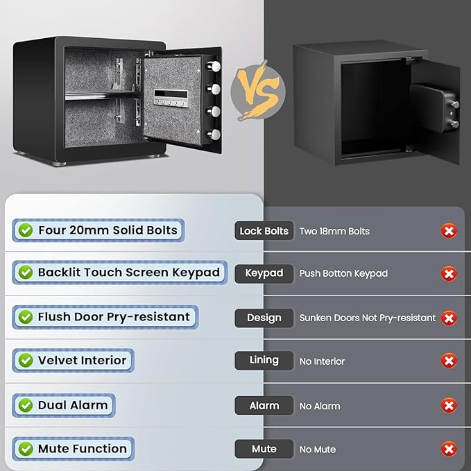 - ADVANCED BIOMETRIC RECOGNITION, SMART CONVENIENCE - Here's the scoop on the bio fingerprint upgrade: Kavey home safe now features a top-notch high-resolution biometric sensor that can detect details at 650 DPI and unlock in a speedy 0.1 seconds. Plus, it can store up to 20 different fingerprints, making it a breeze for multiple users to share access. How impressive is that, right?