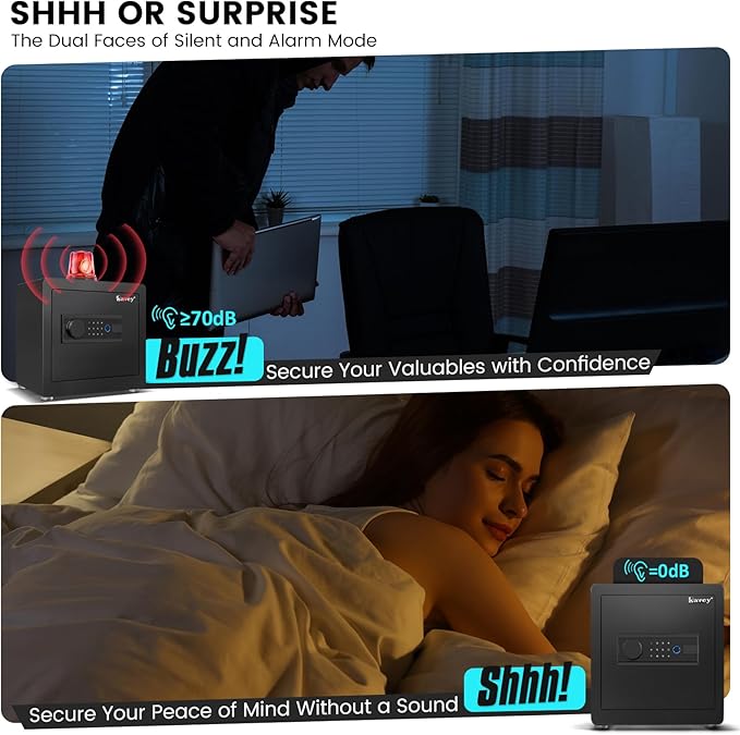 - POWERHOUSE OF SAFETY, DUAL ALARM MASTERY - Hey, safety isn't just a talk—it's a sure thing with the Kavey Home Safe! This money safe is like a security champ with its dual alarm system, ready to take on thieves and those nosy hands. Mess up the password thrice or try to bust in forcefully, and bam! The safe springs into action. And guess what? It belts out a loud 70-decibel alarm that fills the room, scaring off even the bravest intruders. Cool, right?