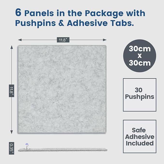 - 【Customizable Versatility】:Each set includes 6 felt panels (11.8"x11.8", 0.35" thick), special tape and 30 push pins, allowing you to create various poster board sizes like 24"x36" or 24"x48". The high-density felt is self-healing, so it looks new even after multiple uses, no unsightly pin holes.