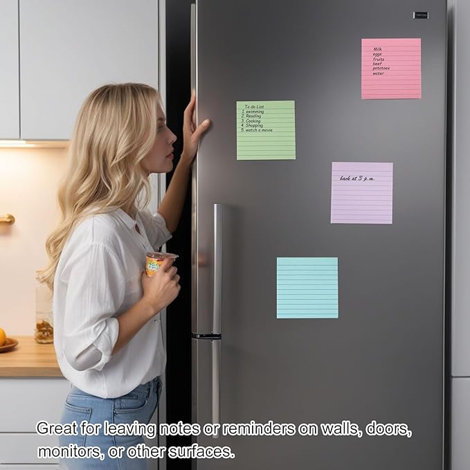 - Super Sticking: HQCME lined sticky notes 4x4 have strong adhesive, make sure sticky notes don't fall off, and removes cleanly as well. Won't damage surfaces or leave an adhesive residue, that allows reapplication as many times as needed