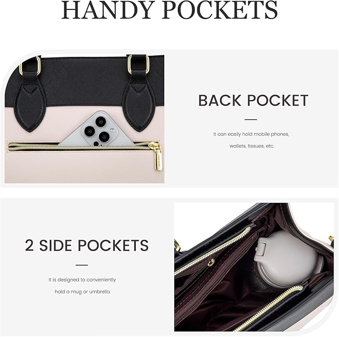 - 【Multi-pocket Handbag】 The main compartment incorporates various pockets for organized storage, including a laptop compartment, tablet compartment, large zipper pocket, two open pockets, a small zipper pocket, two pen slots. Each pocket is strategically placed for easy access and efficient organization
